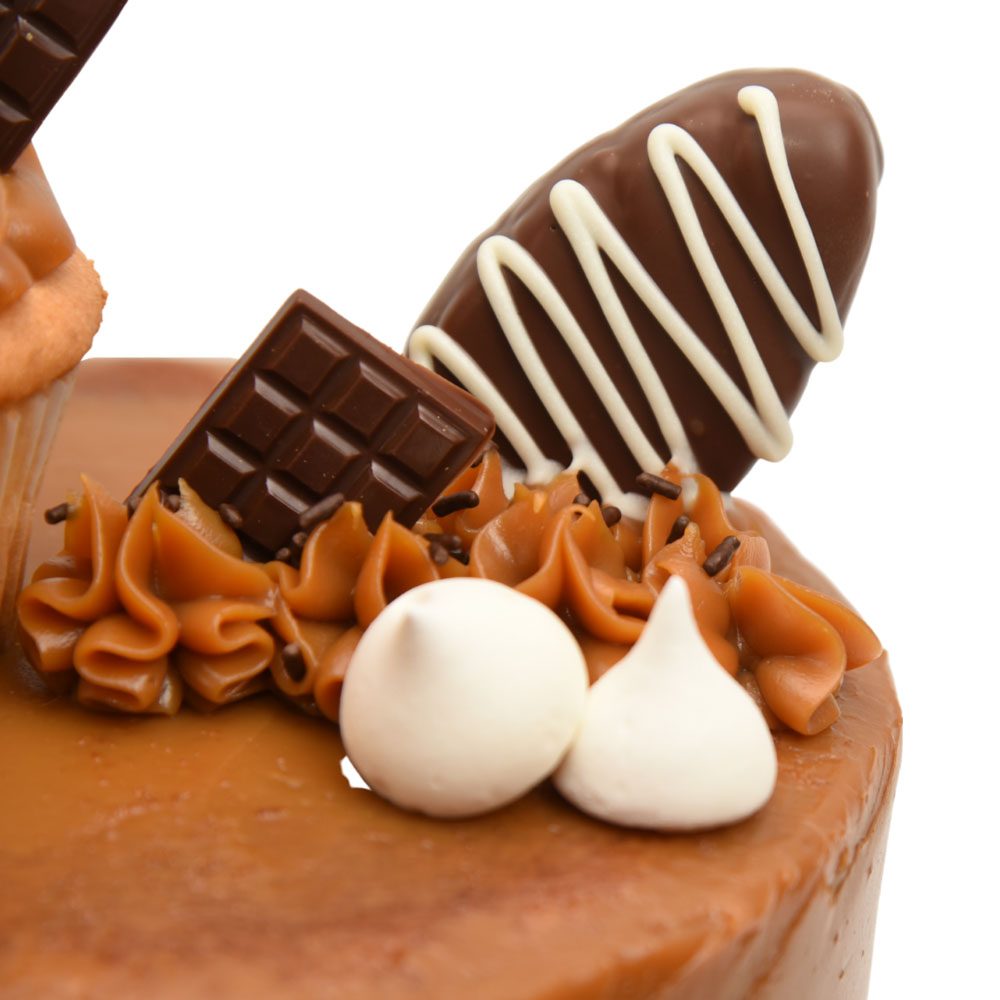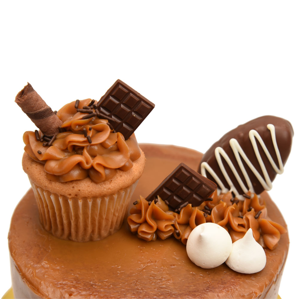 Nuestra esponjosa torta de vainilla rellena de un delicioso arequipe con doble capa y enmascarada con mucho más arequipe, una paleta de brownie cubierta de chocolate, decoración con suspiros y chocolates.