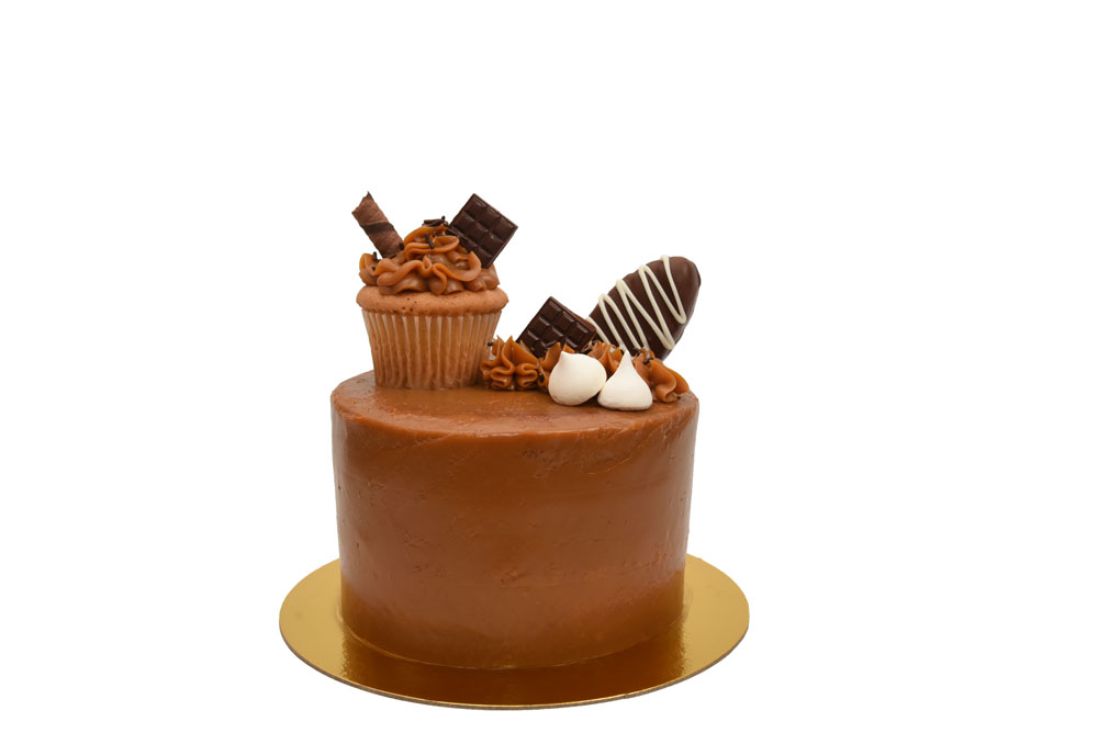 Nuestra torta de chocolate está cubierta y rellena con una deliciosa ganache de chocolate. Decorada con un cupcake de chocolate y una trufa dorada.