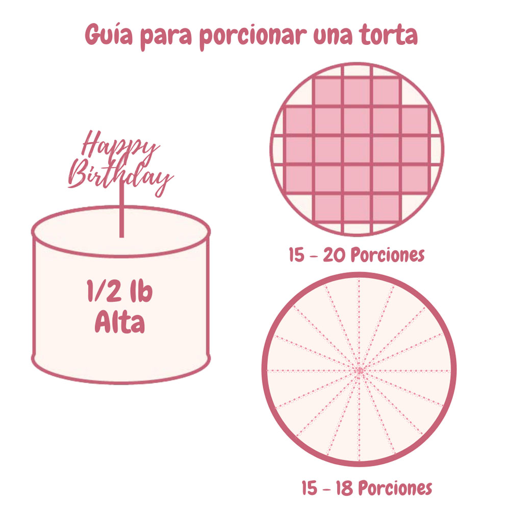 La torta, como se muestra, es de 1/2 libra y sirve de 15 a 18 porciones y la torta de 1 libra alta es de 25-28 porciones. T